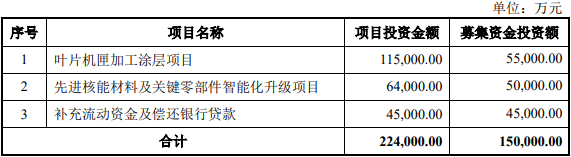 本次向不特定对象发行可转换公司债券募集资金总额不超过150,000.00万元(含本数),募集资金扣除相关发行费用后将用于投资以下项目:叶片机匣加工涂层项目、先进核能材料及关键零部件智能化升级项目、补充流动资金及偿还银行贷款。