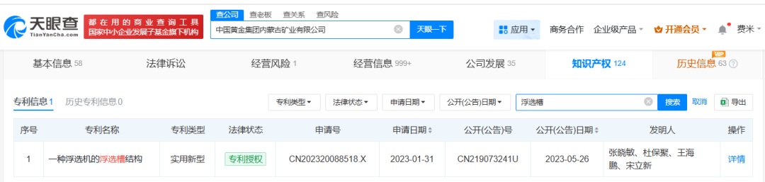 天眼查App显示,涉事公司中国黄金集团内蒙古矿业有限公司成立于2005年11月,法定代表人为张化武,注册资本4亿人民币,经营范围包括矿山设备及材料销售、矿业开发技术咨询服务、矿业投资等,由中金黄金股份有限公司、北京予捷矿业投资有限公司共同持股。知识产权信息显示,该公司申请的“一种浮选机的浮选槽结构”专利已获授权。天眼风险信息显示,该公司抽查检查结果有发现隐患9条、发现隐患18条等结果,检查实施机关为呼伦贝尔市应急管理局。